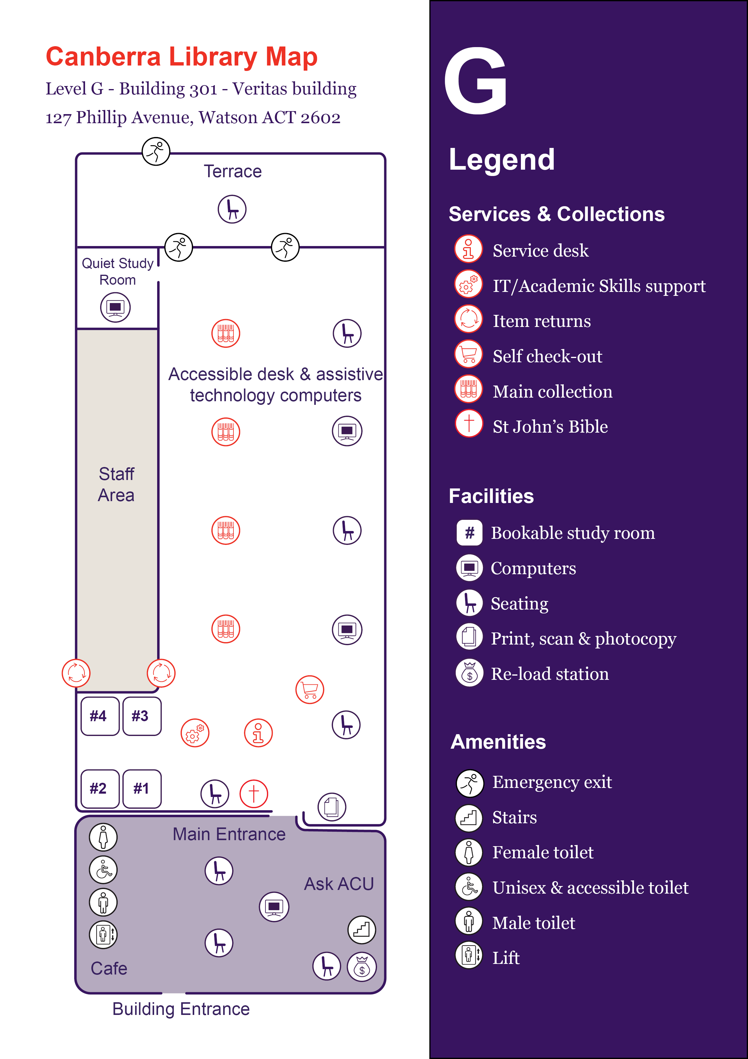 | G | Main entrance | Seating St John’s Bible Print, scan & photocopy machines |
