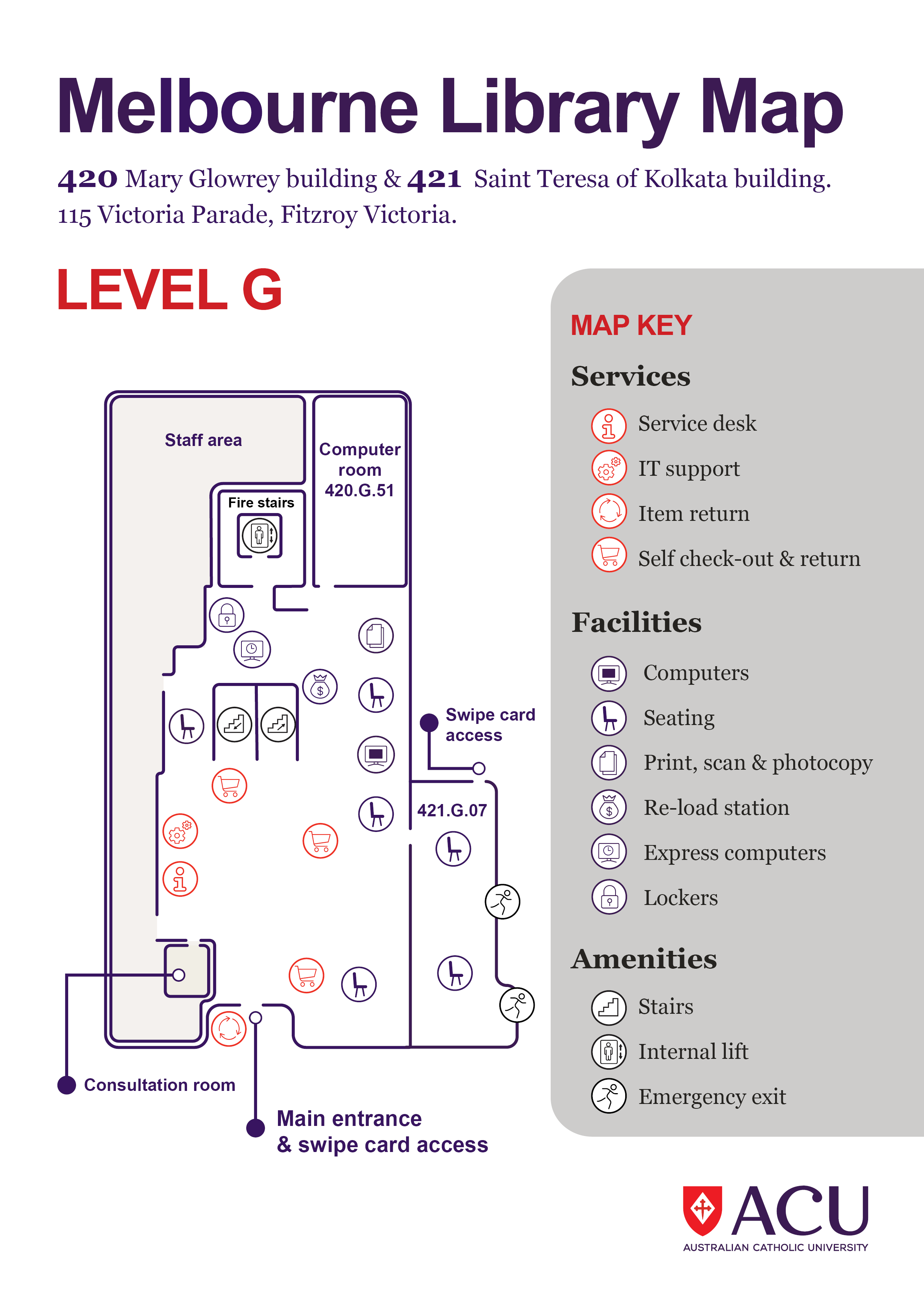 Computers Print, scan & photocopy Seating Stairs to level G |