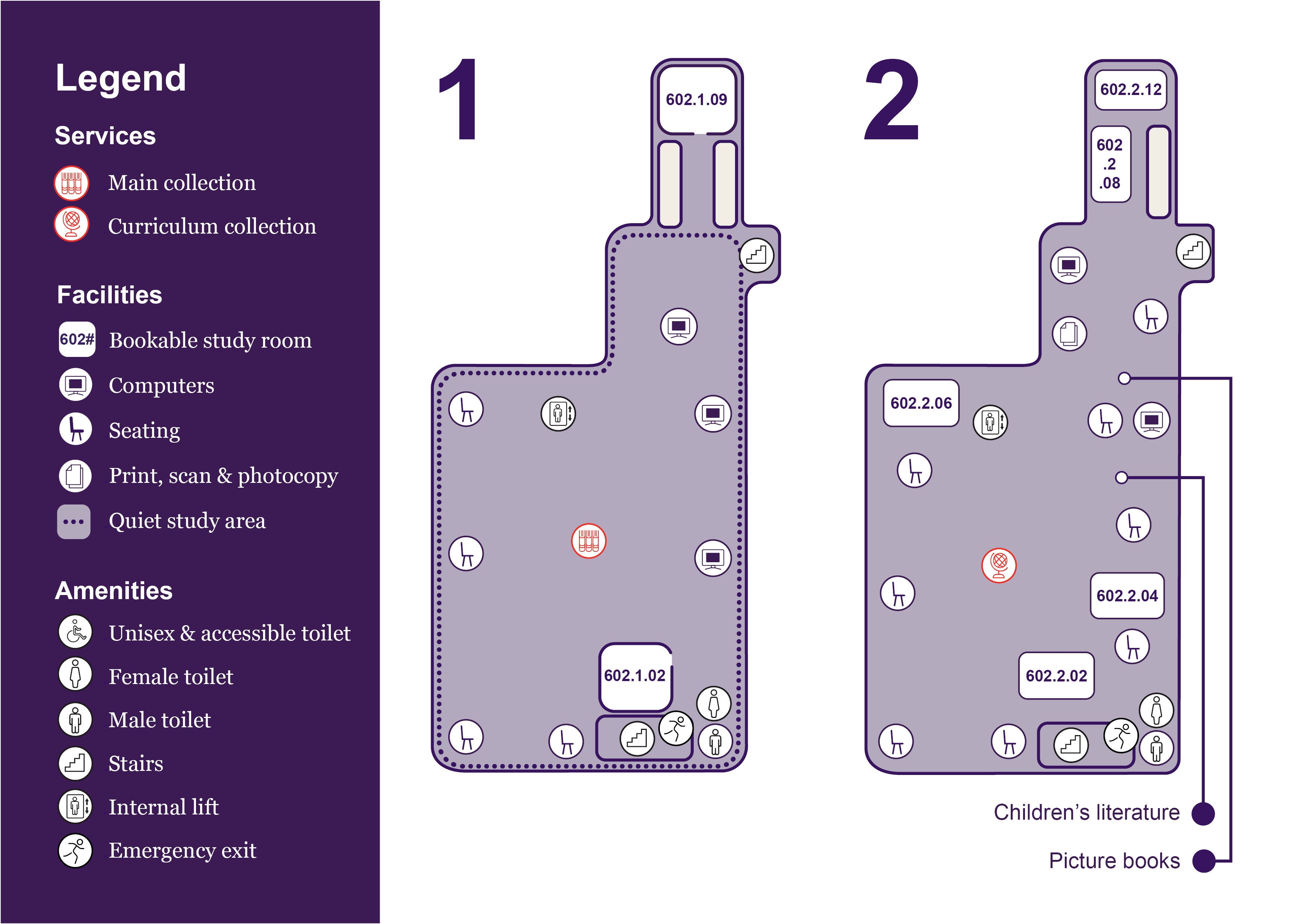 Children’s literature Computers Emergency stairs and exit Female and male toilets Internal lift Picture books Print, scan & photocopy machine Seating |